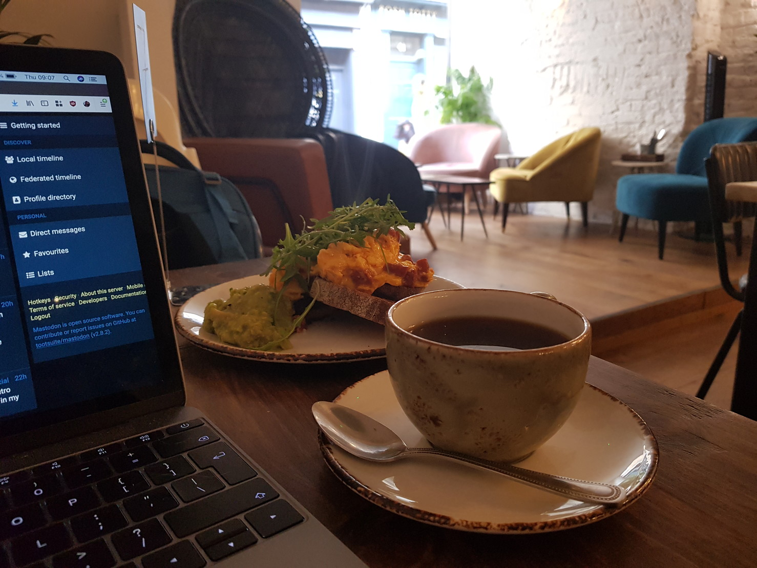 On the photo, a delicious filtered :coffee: and some chorizo enhanced scrambled eggs.